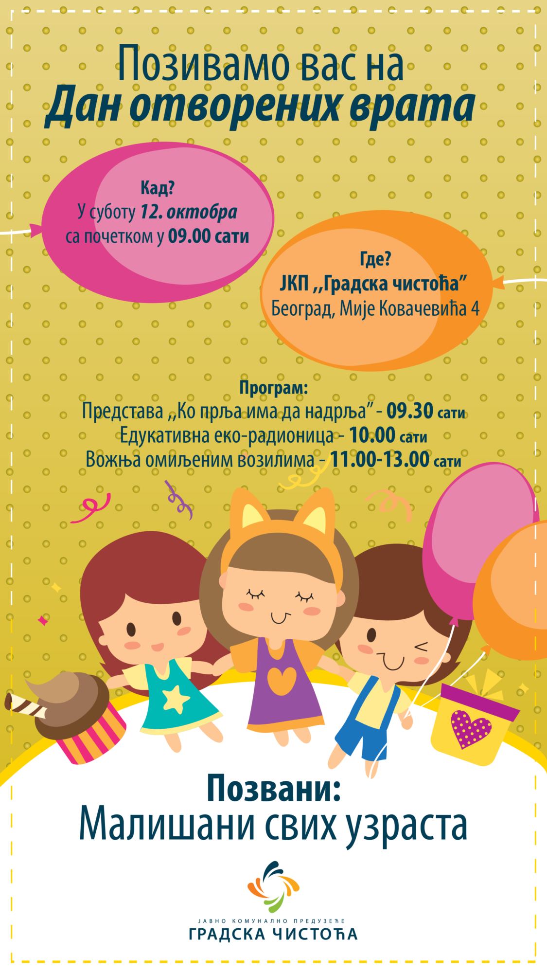 октобар 10, 2024Београд, 10. октобар 2024. године– ЈКП „Градска чистоћа” традиционално и ове године, као већ годинама уназад отвара капије за све малишане Београда који желе да посете предузеће и упознају се са запосленима и начином рада. Ове године, ово едукативно, креативно и весело окупљање београдских школараца и предшколараца, њихових пратилаца и запослених у ЈКП „Градска чистоћа“ биће уприличено у суботу 12. октобра са почетком у 9 часова у обезбеђеном простору дирекције предузећа, на адреси Улица Мије Ковачевића 4.
